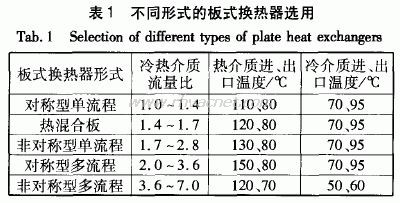 換熱器板間流道內(nèi)介質(zhì)平均流速以0.3~0.6m/s為宜,阻力以不大于100 kPa為宜。根據(jù)不同冷熱介質(zhì)流量比,可參照表1選用不同形式的板式換熱器,表中非對稱型板式換熱器流道截面積比為2。采用對稱型或非對稱型、單流程或多流程板式換熱器,均可設(shè)置換熱器旁通管,但應(yīng)經(jīng)詳細(xì)的熱力計算。