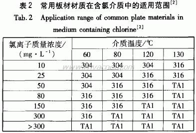 不銹鋼板片可能產(chǎn)生腐蝕失效的現(xiàn)象有點蝕、縫隙腐蝕、應(yīng)力腐蝕、晶間腐蝕、均勻腐蝕等,應(yīng)力腐蝕的發(fā)生率較高。由氯離子引起的應(yīng)力腐蝕最多,板片材質(zhì)可根據(jù)介質(zhì)中的氯離子質(zhì)量濃度按表2選用 ],表中304、316代表的不銹鋼材料牌號為OCrl8Ni9、0Crl7Nil2Mo2,TA1代表鈦合金。